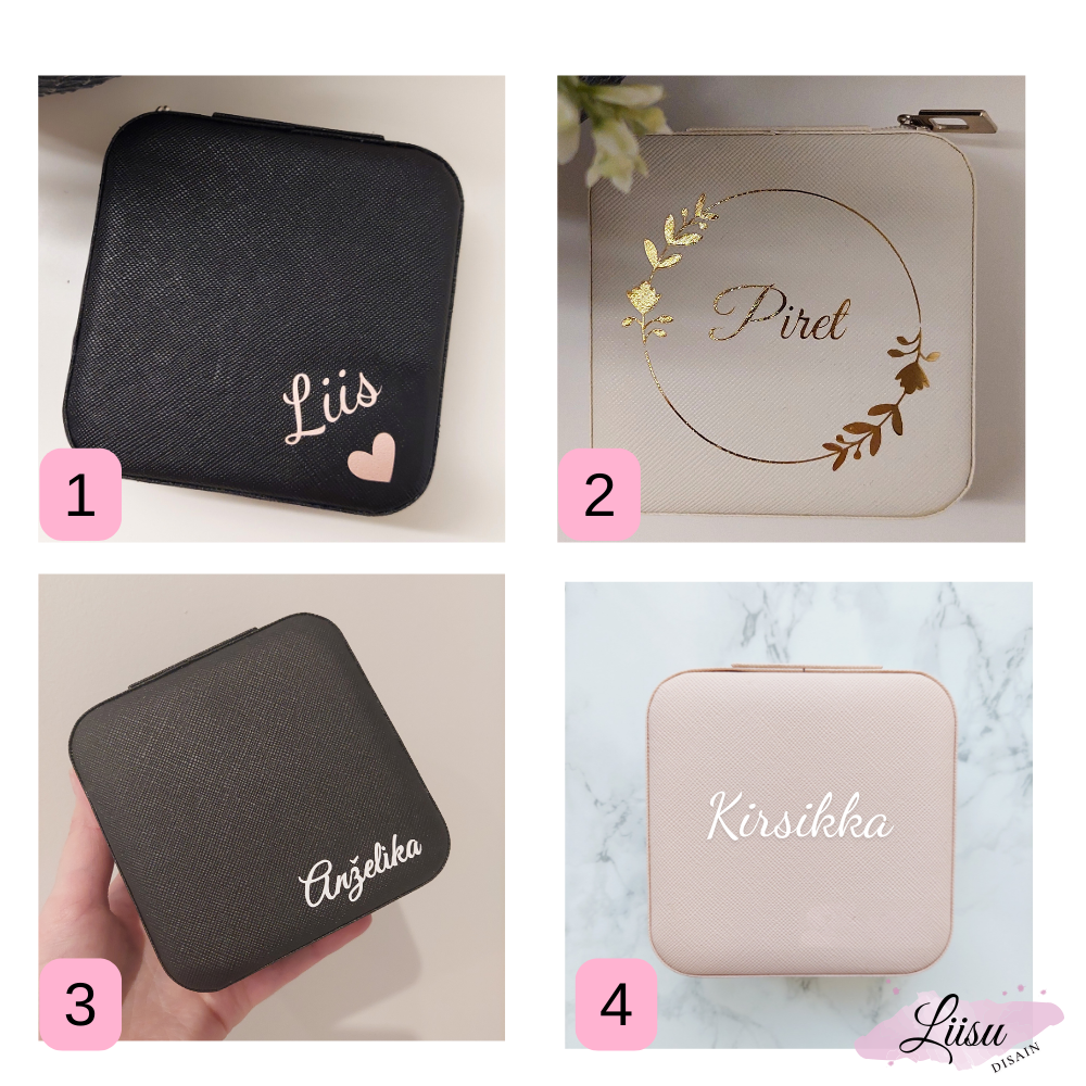 Armas personaliseeritav kinkekomplekt naisterahvale või väikesele neiule. Karp sisaldab musta ehetekarpi ja vabalt valitud materjali ning värviga scrunchie patsikummi. Ehtekarbile saab lisada Sinu soovitud värvi ja kirjastiiliga teksti.